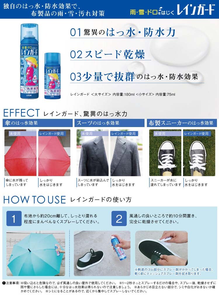 ●すぐれたはっ水効果で、雨・雪・ドロをはじく衣類・布製品用はっ水スプレーです。雨の日のお出かけがより快適になります。スプレーするだけで、強力はっ水!雨はもちろん、ドロはねなどの汚れからも守ります。スーツ、スラックス、スカート、レインコート、傘などに雨がしみこむのを防ぎます。 スポーツウエア、布製スニーカー、布製のエコバッグなどを、雨や雪、汚れから守ります 。