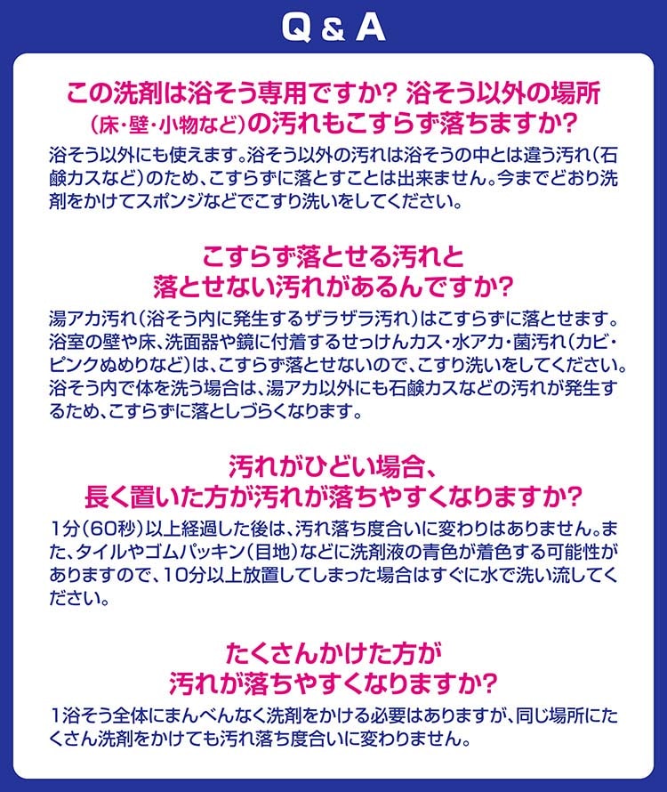 ●浴そうにシューーーッとかけて60秒後に流すだけで、翌日までお湯を放置したザラザラ汚れや、湯抜き後時間が経ったカピカピ汚れ、くり返し入浴のたっぷり汚れなど、頑固汚れもこすらずに洗える。