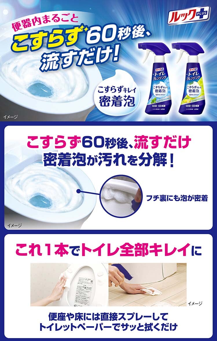 ●たっぷりの密着泡で便器内全体を覆って、60秒後に流すだけでお掃除ができるトイレ用洗剤。便座・床もこれ1本でサッと拭くだけ。
