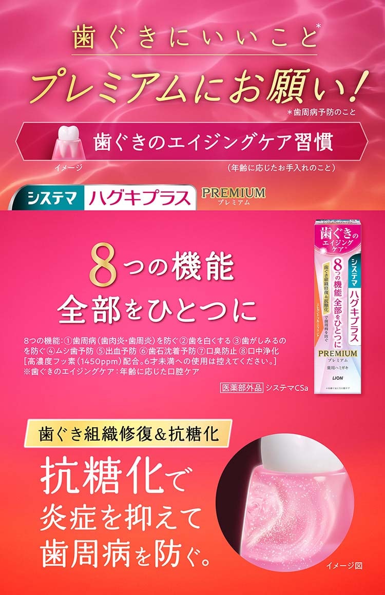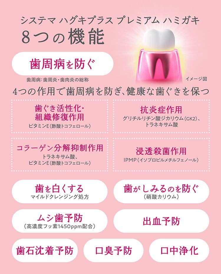 ●おとろえてきた歯ぐき組織を修復し、炎症を抑えて歯周病を防ぐとともに、8つの機能全部がひとつになったプレミアム処方の薬用ハミガキ