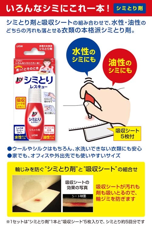 ●シミとり剤と吸収シートの組み合わせで、水性・油性のどちらの汚れも落とせる衣類の本格派シミとり剤。