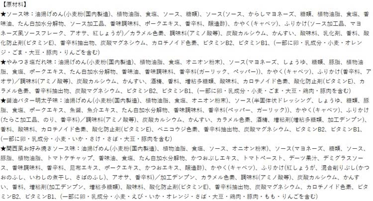 ★醤油バター明太子味:小麦、卵、乳成分、豚肉、いか、さけ、さば、大豆