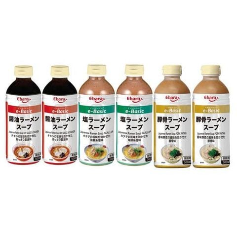 | e-Basic:醤油ラーメンスープ/500ml×2本、豚骨ラーメンスープ/500ml×2本、塩ラーメンスープ/500ml×2本 計3種6本 |