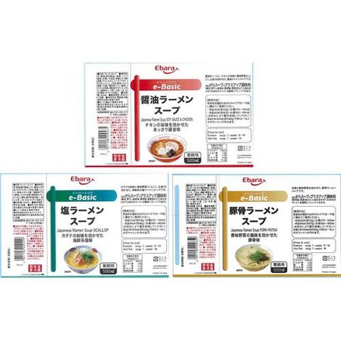 | ・e-Basic 醤油ラーメンスープ:醤油(国内製造)、食塩、アミノ酸液、砂糖、大豆油、果糖ぶどう糖液糖、チキンエキス、メンマパウダー、もろみ、にんにく、ごま油、酵母エキス、胡椒、生姜/調味料(アミノ酸等)、カラメル色素、増粘剤(キサンタンガム)、酸味料、(一部に小麦・ごま・大豆・鶏肉・ゼラチンを含む) ・e-Basic 豚骨ラーメンスープ:ポークエキス(国内製造)、食塩、醤油、砂糖、アミノ酸液、オイスターソース、ごま油、胡椒、酵母エキス、玉ねぎ/調味料(アミノ酸等)、増粘剤(キサンタンガム)、香料、カラメル色素、酸化防止剤(ビタミンE)、(一部に小麦・ごま・大豆・鶏肉・豚肉を含む) ・e-Basic 塩ラーメンスープ:食塩(国内製造)、アミノ酸液、大豆油、ホタテエキス、ごま油、胡椒、にんにく、酵母エキス、生姜/調味料(アミノ酸等)、カラメル色素、増粘剤(キサンタンガム)、香料、香辛料抽出物、(一部に小麦・ごま・大豆・ゼラチンを含む) |