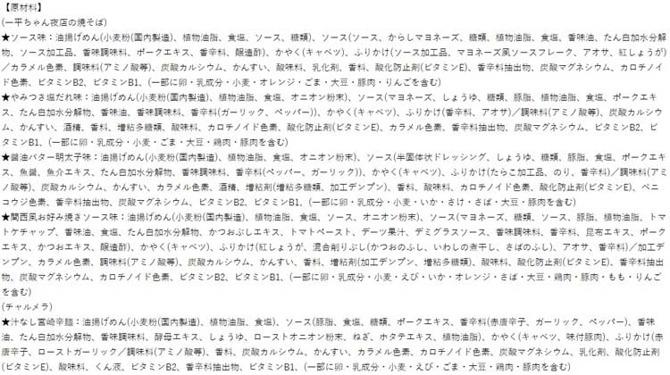 | ・一平ちゃん夜店の焼そば ★ソース味:小麦、卵、乳成分、豚肉、大豆、ごま、りんご、オレンジ ★やみつき塩だれ味:小麦、卵、乳成分、豚肉、鶏肉、大豆、ごま ★醤油バター明太子味:小麦、卵、乳成分、豚肉、いか、さけ、さば、大豆 ★関西風お好み焼ソース味:小麦、卵、乳成分、えび、豚肉、鶏肉、いか、さば、大豆、りんご、オレンジ、もも ・チャルメラ ★汁なし宮崎辛麺:小麦、卵、乳成分、えび、豚肉、鶏肉、大豆、ごま |