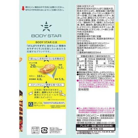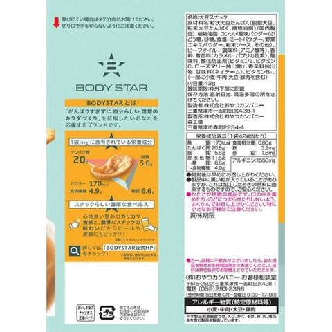 | ★BODYSTARプロテインスナックコンソメ味:粒状大豆たんぱく(脱脂大豆、粉末大豆たんぱく、植物油脂)(国内製造)、植物油脂、コンソメ風味パウダー(ぶどう糖、砂糖、食塩、ミートパウダー、野菜エキスパウダー、粉末ソース、その他)、ビーフオイル/調味料(アミノ酸等)、香料、着色料(カラメル、パプリカ色素)、酸味料、酸化防止剤(ビタミンE、ビタミンC、ローズマリー抽出物)、香辛料抽出物、甘味料(ネオテーム)、ビタミンB1、(一部に小麦・牛肉・大豆・豚肉を含む) ★BODYSTARプロテインスナックバーベキュー味:粒状大豆たんぱく(脱脂大豆、粉末大豆たんぱく、植物油脂)(国内製造)、植物油脂、バーベキュー風味パウダー(砂糖、ぶどう糖、野菜パウダー、粉末しょうゆ、酵母エキスパウダー、たんぱく加水分解物、食塩、その他)、ビーフオイル/調味料(アミノ酸等)、カラメル色素、香料、酸味料、酸化防止剤(ビタミンE、ビタミンC)、甘味料(ネオテーム)、香辛料抽出物、ビタミンB1、(一部に小麦・牛肉・大豆を含む) ★プロテインスナックカレー味:大豆加工食品(脱脂大豆、粉末状大豆たんぱく、でん粉、植物油脂)(国内製造)、植物油脂、カレー風味パウダー(グラニュー糖、食塩、カレー粉、ポーク風味調味料、たんぱく加水分解物、ガーリックパウダー、クミンパウダー、その他)、ビーフオイル/炭酸Ca、調味料(アミノ酸等)、酸化防止剤(ビタミンE、ビタミンC)、香料、香辛料抽出物、甘味料(ステビア、カンゾウ)、パプリカ色素、酸味料、ビタミンB1、(一部に小麦・乳成分・牛肉・大豆・鶏肉・豚肉を含む) ★プロテインスナックサワークリームオニオン味:大豆加工食品(脱脂大豆、粉末状大豆たんぱく、でん粉、植物油脂)(国内製造)、植物油脂、サワークリームオニオン風味パウダー(グラニュー糖、食塩、乳等を主要原料とする食品、でん粉、オニオンパウダー、粉末酢、その他)/炭酸Ca、調味料(アミノ酸等)、香料、酸味料、酸化防止剤(ビタミンE、ビタミンC)、(一部に小麦・乳成分・大豆を含む) |