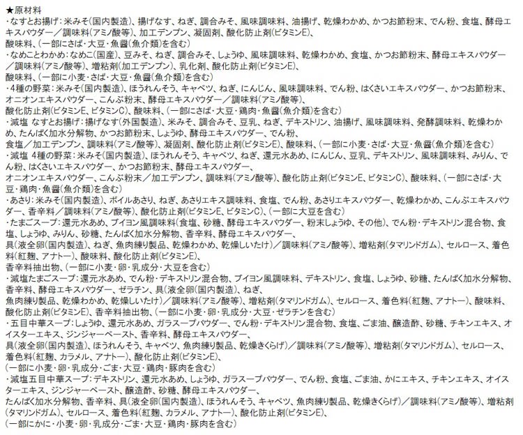 | ・なすとお揚げ:さば、大豆、魚醤(魚介類) ・なめことわかめ:小麦、さば、大豆、魚醤(魚介類) ・4種の野菜:さば、大豆、鶏肉、魚醤(魚介類) ・減塩 なすとお揚げ:小麦、さば、大豆、魚醤(魚介類) ・減塩 4種の野菜:さば、大豆、鶏肉、魚醤(魚介類) ・あさり:大豆 ・たまごスープ:小麦、卵、乳、大豆 ・減塩たまごスープ:小麦、卵、乳、大豆、ゼラチン ・五目中華スープ:小麦、卵、乳、ごま、大豆、鶏肉、豚肉 ・減塩五目中華スープ:かに、小麦、卵、乳、ごま、大豆、鶏肉、豚肉 |