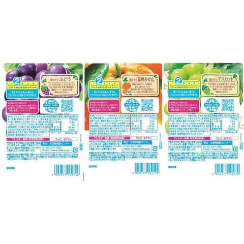 ・果汁グミマスカット:水あめ(国内製造)、砂糖、濃縮マスカット果汁、ゼラチン、食用油脂、でん粉/酸味料、香料、ゲル化剤(ペクチン)、光沢剤、(一部にりんご・ゼラチンを含む)