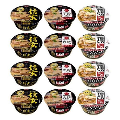 | 大砲(とんこつ)/128g×4食、信玄(味噌)/121g×4食、坂内(醤油ワンタン)/108g×4食 計3種12食 |