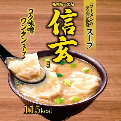 ・札幌らーめん信玄 コク味噌味:「札幌らーめん 信玄」監修のまろやかな味わいの味噌スープに、つるみのあるノンフライワンタンが入った、満足感のある一杯。