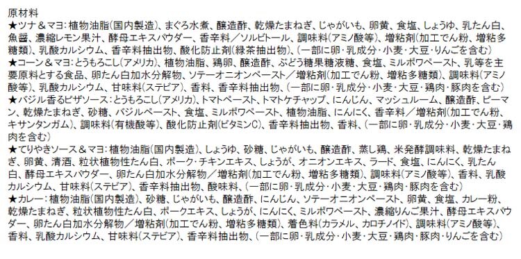 | ★ツナ&マヨ/卵、乳成分、小麦、大豆、りんご ★コーン&マヨ/卵、乳成分、小麦、大豆、鶏肉、豚肉 ★バジル香るピザソース/卵、乳成分、小麦、大豆、鶏肉 ★てりやきソース&マヨ/卵、乳成分、小麦、大豆、鶏肉、豚肉 ★カレー/卵、乳成分、小麦、大豆、鶏肉、豚肉、りんご |