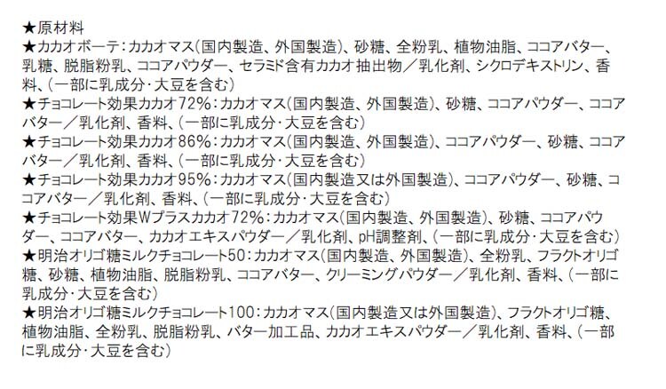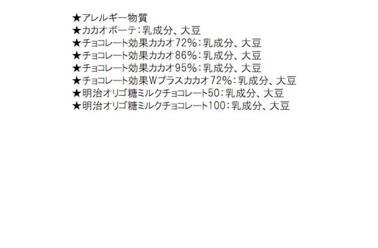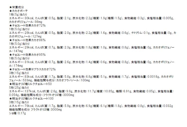 | カカオボーテ:1箱60g×1個 チョコレート効果カカオ72%:1箱65g×1個 チョコレート効果カカオ86%:1箱60g×1個 チョコレート効果カカオ95%:1箱60g×1個 チョコレート効果Wプラスカカオ72%:1箱75g×1個 明治オリゴ糖ミルクチョコレート50:1箱65g×1個 明治オリゴ糖ミルクチョコレート100:1箱45g×1個 計7種7個 |