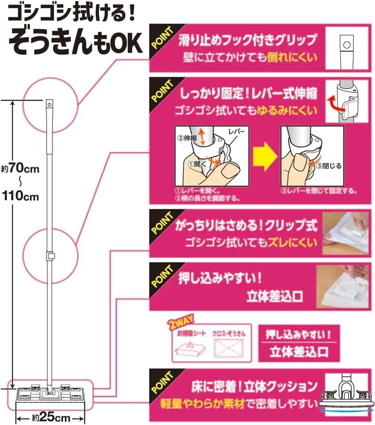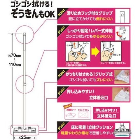 ●お掃除シートだけではなく、ぞうきんやクロスも取り付けられるフロアワイパーです。