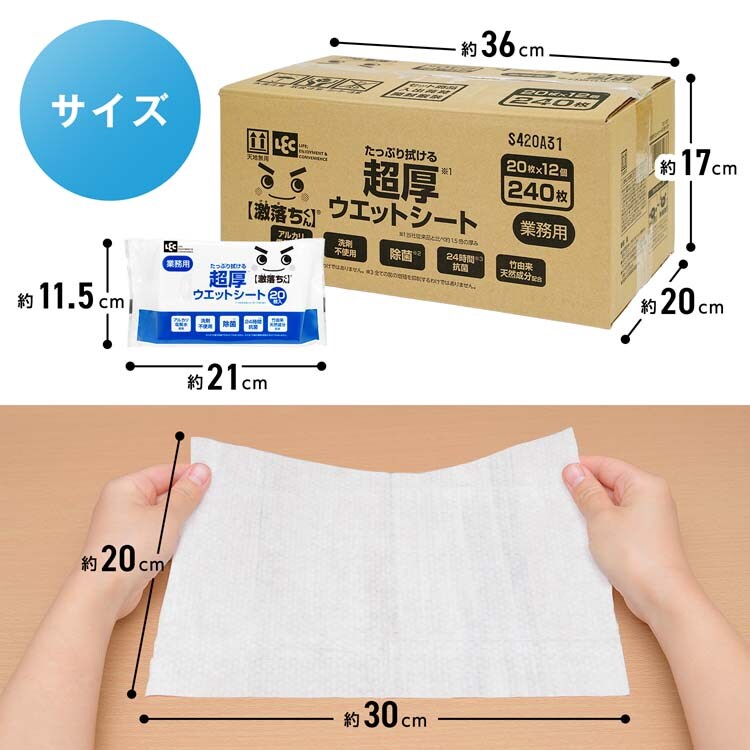 激落ちくん 掃除用 超厚ウエットシート 業務用 洗剤不使用 除菌 抗菌 (20枚入×12個)