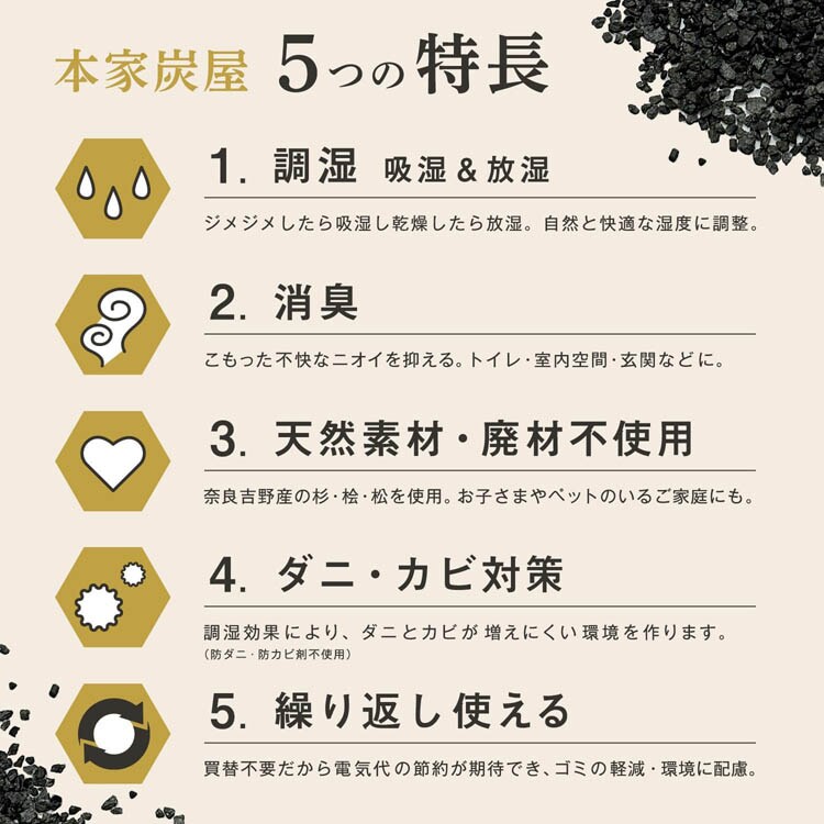 ●消臭力にも優れており、炭の持つ吸着作用で、生活空間にこもる不快なニオイを抑えます。