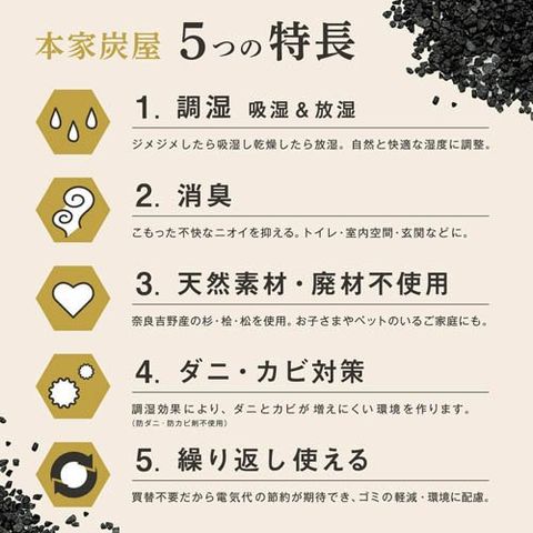 ●天然素材である奈良吉野産の炭を使用しています。天然素材の杉・桧・松を使用しており、廃材などは一切使用しておりません。