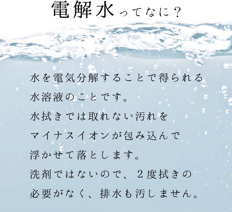 | 水、エタノール、アルカリ電解水、pH安定剤、除菌剤、セスキ炭酸ソーダ |