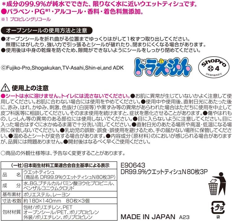 ドラえもん 純水99.9% ウエットティシュ (80枚×3パック)