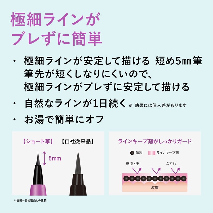 ●撥水効果のある「フィルム」に変化するリキッドタイプだから皮脂、汗、涙、こすれからラインをしっかりガード。もちが良いのに、落とすときはお湯で簡単オフ。