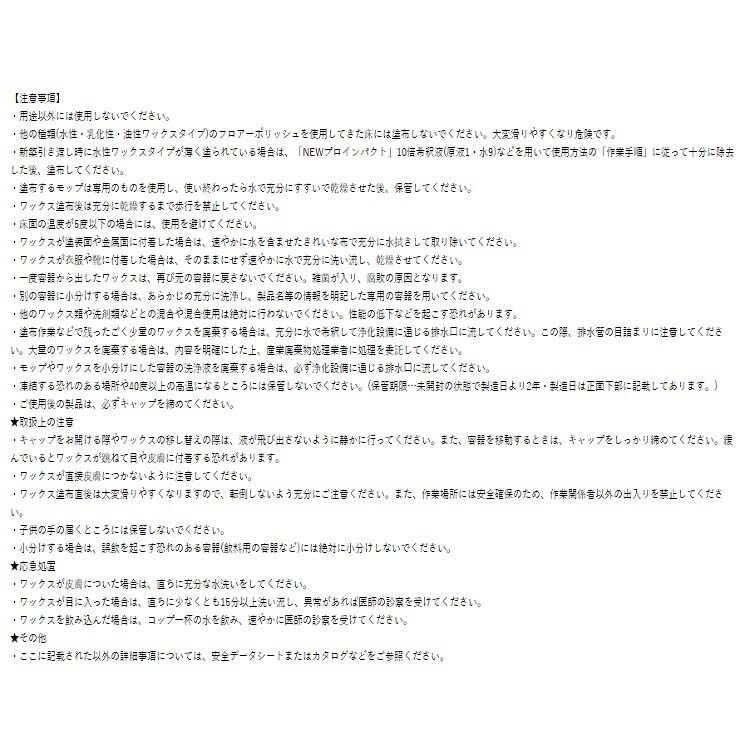 ワックス塗布:清浄な塗布用モップにワックスを充分にしみ込ませ、均一にムラなく塗り広げます。また、必要に応じて塗膜乾燥後(30分間程度)に重ね塗りします。一作業における塗り重ね回数は4回までを限度としてください。表面洗浄の場合は2~3回塗布します。