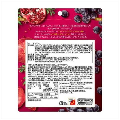 | コラーゲンペプチド(ゼラチンを含む、ドイツ製造)、果糖ぶどう糖液糖、ザクロ濃縮果汁、寒天、こんにゃく粉、大豆胚芽抽出物(大豆イソフラボン含有)、セラミド含有こんにゃく芋粉抽出物、エラグ酸含有ザクロ抽出物、アサイーエキス末、ほうれん草粉末、人参粉末、かぼちゃ粉末、温州みかん粉末、ゆず皮粉末/酸味料、ビタミンC、ゲル化剤(増粘多糖類)、ヒアルロン酸、甘味料(スクラロース、アセスルファムカリウム、ネオテーム)、香料、トマト色素 |
