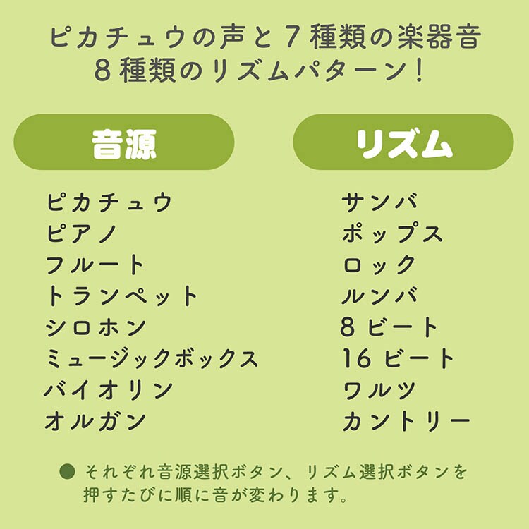 ●楽器音・リズムパターン:(楽器音)→ピカチュウ→ピアノ→フルート →トランペット →シロホン→ミュージックボックス →バイオリン →オルガン、(リズムパターン)→サンバ →ポップス →ロック →ルンバ→8ビート→16ビート →ワルツ →カントリー