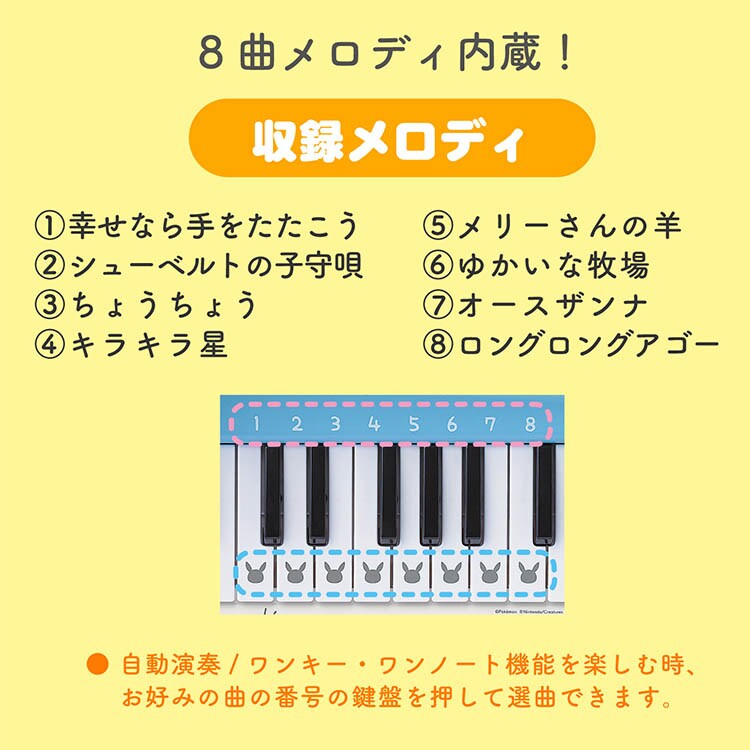 ●ゆかいな8曲のメロディ:8曲のメロディを自動演奏で楽しめます。収録メロディはワンキー・ワンノートと同じです。