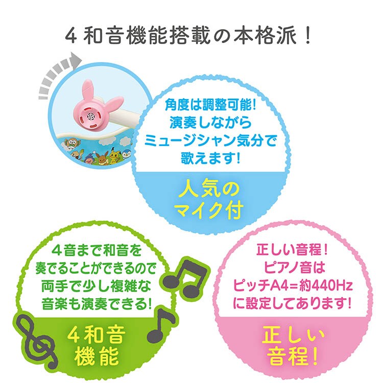 ●ピカチュウの声がする!:ピカチュウモードでマークのついた鍵盤を押すと、ピカチュウの声で「ピカー♪」、「ピカー♪」、「ピカー♪」とドレミを演奏できます。4つの黄色のボタンを押すとそれぞれ「ピカチュウ!」「ピカピカー!」など4種類のピカチュウの声が楽しめます。