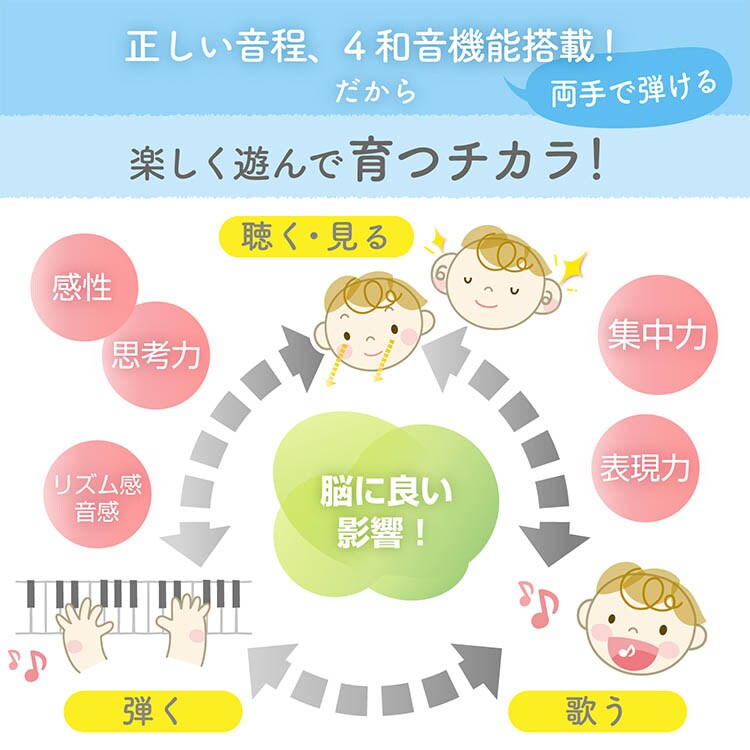 ●楽しく遊んで育つチカラ:正しい音程、4和音機能搭載の両手で弾ける本格派キーボードだから、さまざまな知育効果が期待できます。