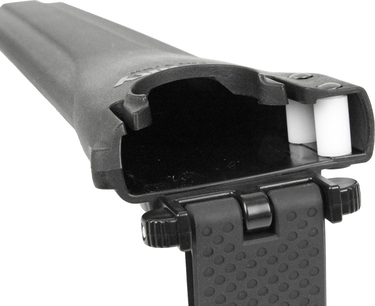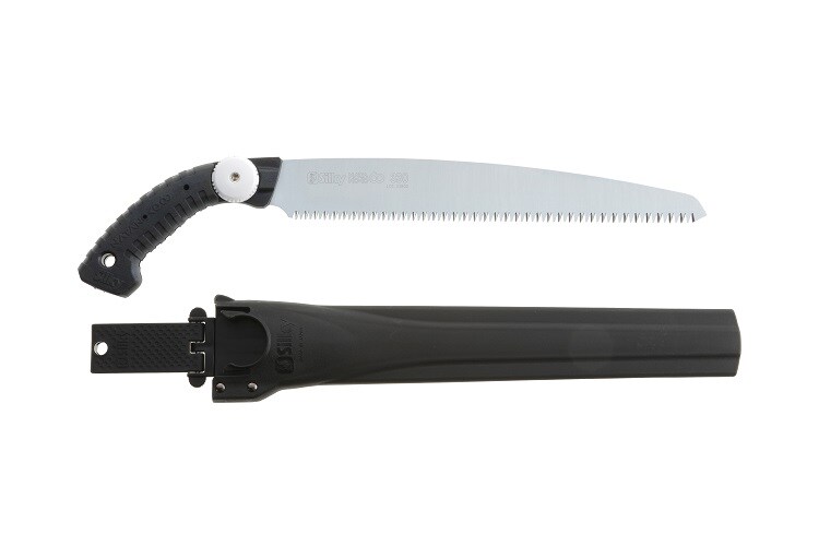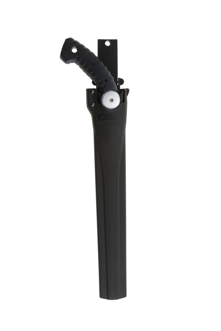 刃と本体が一体型で安定性に優れ太い枝もスピーディーに切断可能です。刃の木に対する食い込みを高めるために今までにない鋭い刃の角度を採用し、厚みも1.4mmと少し厚めにすることで強度も上がりました。切り口もアサリ無しなのでカンナで削ったように綺麗に仕上がり、剪定はもちろん間伐や枝打ちに適しています。ハンドルに鋸のブレードを差し込むモノコックハンドルにし、最小限の金具を使うことで軽量化にも成功。鋸を鞘に安全にしまっておけるように、ストッパー機構を付けており、ご使用になる時はワンタッチで抜く事ができます。