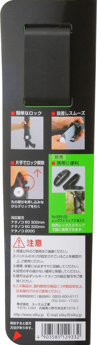 | ・刃:鋼(SK-4) ・柄:加硫合成ゴム ・刃長:330mm ・目数(30mm):7-8枚目 ・刃厚:1.5mm ・切幅:1.4mm ・全長:収納時500mm(鞘入り時)・使用時490mm ・重量:460g ・アサリ無し・目立て直し可能 ・ゴムハンドル・ハードクロームメッキ ・用途:生木(剪定・枝打)用鋸 |