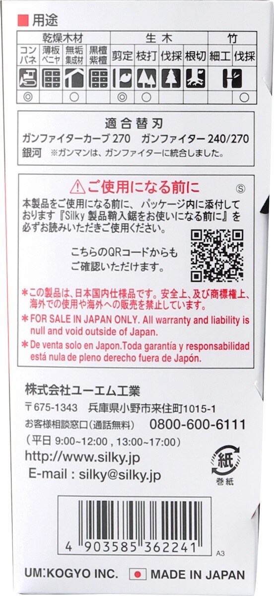 | ・刃長:240mm ・目数(30mm):12枚目 ・刃厚:0.7mm ・切幅:1.05mm ・全長:収納時485mm(鞘入り時)・使用時400mm ・重量:280g ・4列目とびアサリ・衝撃焼入 ・ゴムハンドル・ハードクロームメッキ ・用途:乾燥木材のコンパネ・無垢集成材・垂木・角材・竹・生木の枝打・剪定用鋸 |