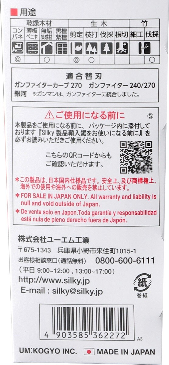 ・用途:乾燥木材のコンパネ・無垢集成材・垂木・角材・竹・生木の枝打・剪定用鋸