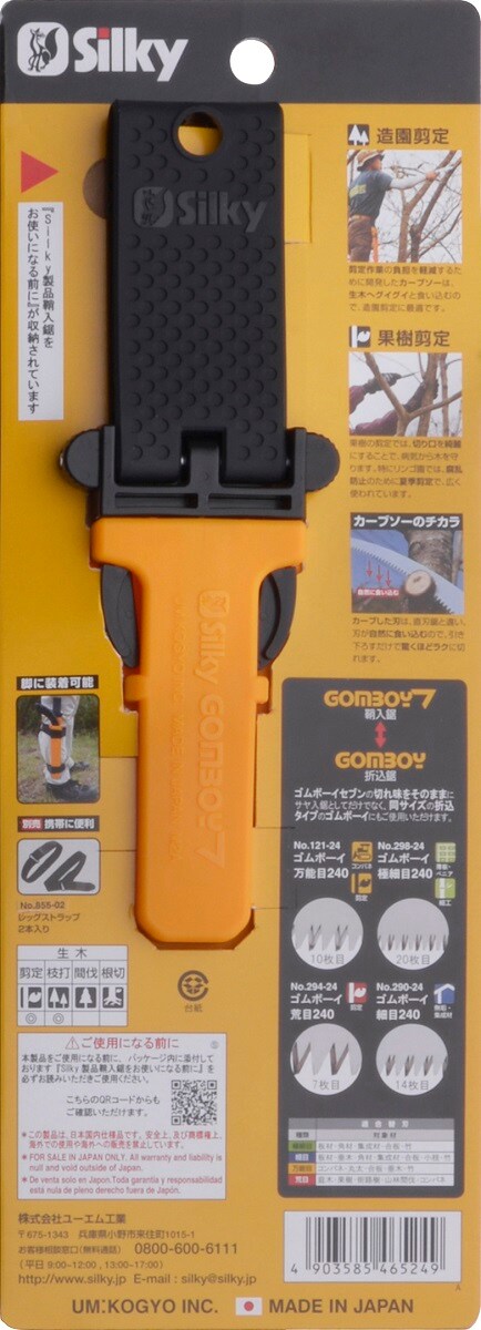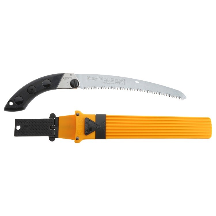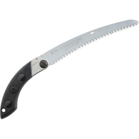 ゴムボーイカーブの刃がサヤ入り鋸で使えます。抜き差し便利で切れ味抜群です。足場が不安定な場所や肩より上での作業等、様々な場所で快適に剪定できます。カーブした刃は、直刃鋸と違い、刃が自然に食い込むので、引き下ろすだけで楽に切れます。