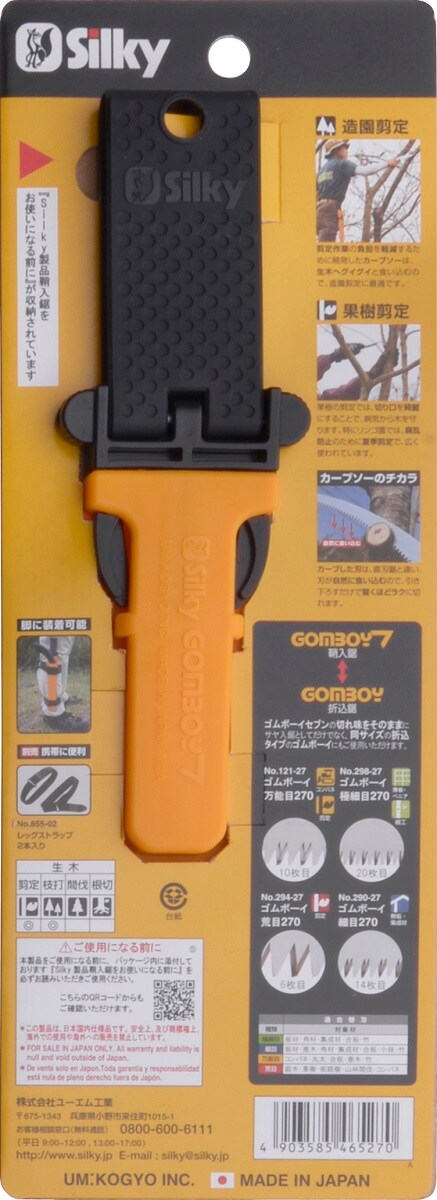 | ・刃長:270mm(荒目) ・目数(30mm):8枚目 ・刃厚:1.4mm ・切幅:1.3mm ・全長:収納時480mm・使用時430mm ・重量:405g ・アサリ無し・衝撃焼入・未来目 ・用途:剪定・枝打ち作業用鋸 |