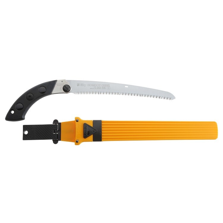 ゴムボーイカーブの刃がサヤ入り鋸で使えます。抜き差し便利で切れ味抜群です。足場が不安定な場所や肩より上での作業等、様々な場所で快適に剪定できます。カーブした刃は、直刃鋸と違い、刃が自然に食い込むので、引き下ろすだけで楽に切れます。