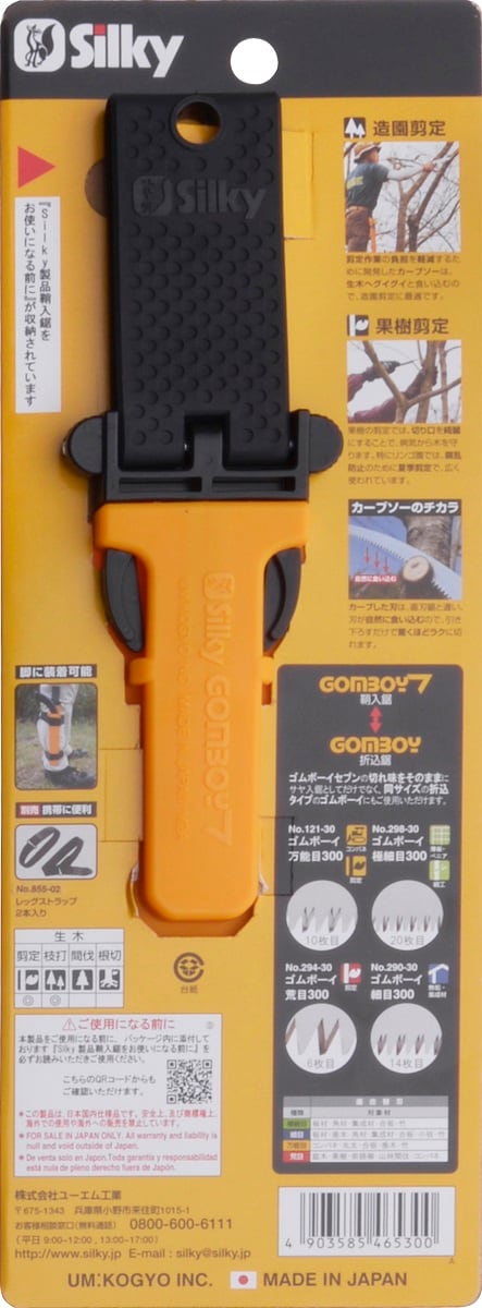 | ・刃長:300mm(荒目) ・目数(30mm):8枚目 ・刃厚:1.4mm ・切幅:1.3mm ・全長:収納時480mm・使用時460mm ・重量:410g ・アサリ無し・衝撃焼入・未来目 ・用途:剪定・枝打ち作業用鋸 |