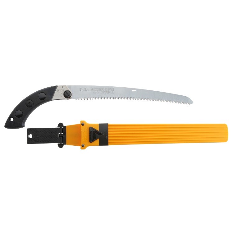 ゴムボーイカーブの刃がサヤ入り鋸で使えます。抜き差し便利で切れ味抜群です。足場が不安定な場所や肩より上での作業等、様々な場所で快適に剪定できます。カーブした刃は、直刃鋸と違い、刃が自然に食い込むので、引き下ろすだけで楽に切れます。