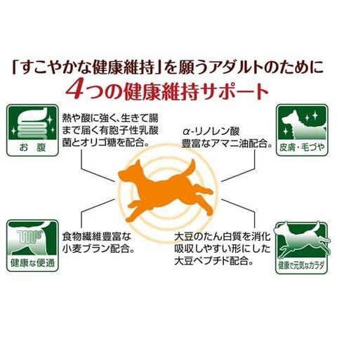 ●「すこやかな健康維持」を願うアダルトのために4つ(お腹、皮膚・毛づや、健康な便通、健康で元気なカラダ)の健康維持サポート。