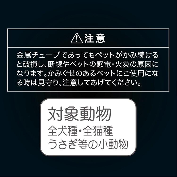 金属チューブであってもペットがかみ続けると破損し、断線やペットの感電・火災の原因になります。かみぐせのあるペットにご使用になる時は見守り、注意してあげてください。