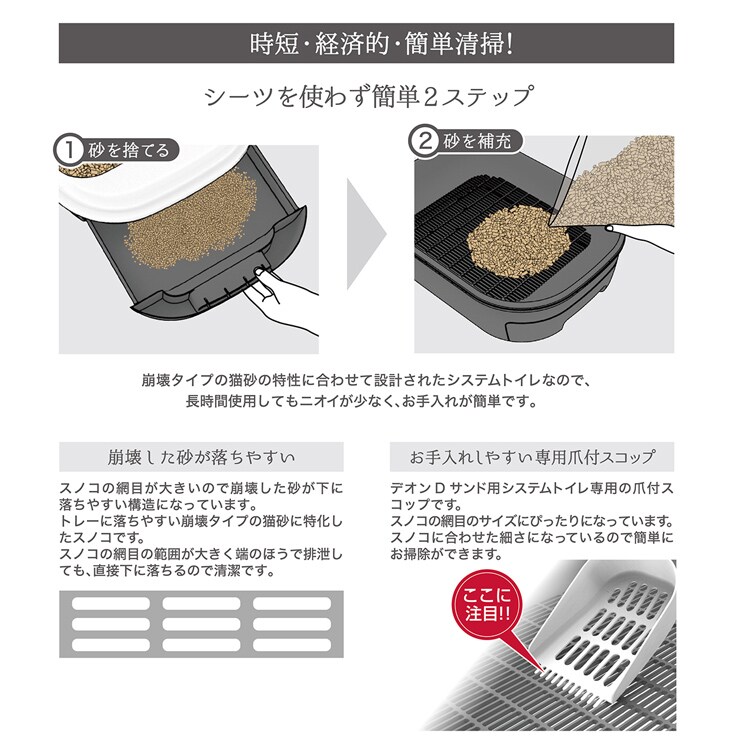 | ・材質:本体・スコップ:ポリプロピレン ・デオンDサンド:木粉・おから・デオンD・抗菌剤 ・本体サイズ:約幅38.0*高さ23.5*奥行51.0(cm)、入り口高さ:約16.5(cm) ・セット内容:デオンDサンド用システムトイレ、専用スコップ、デオンDサンド |
