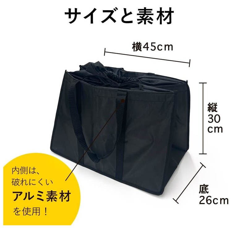 | 本体サイズ:約縦30×横45×底26cm 素材:バッグ:ナイロン/発泡ポリエチレン緩衝材/アルミ、取っ手:ポリプロピレン、ファスナー:ナイロン/ポリエステル |