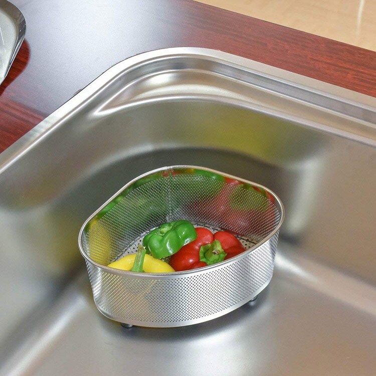 ●水切れは良く、ごみは通しにくいパンチング材、シンクに溜まった水に触れにくい足高タイプなので、衛生的にお使い頂ける。