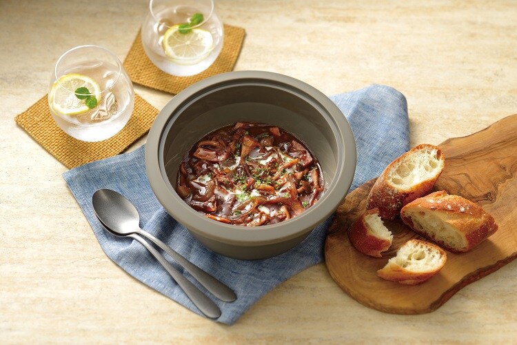 | 商品サイズ:約W205*D205*H99mm 重量:約370g 満水容量:約1.6L 材質:本体:シリコーンゴム(耐熱200度、耐冷-20度) 電子レンジ・食洗器対応 |