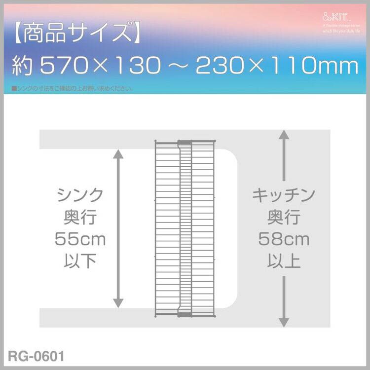 | 商品サイズ:約570×130~230×110mm 重量:約800g 材質:本体・皿立て:ステンレス鋼、ゴム足:シリコーンゴム 対応サイズ:シンク奥行55cm以下/キッチン奥行58cm以上 |