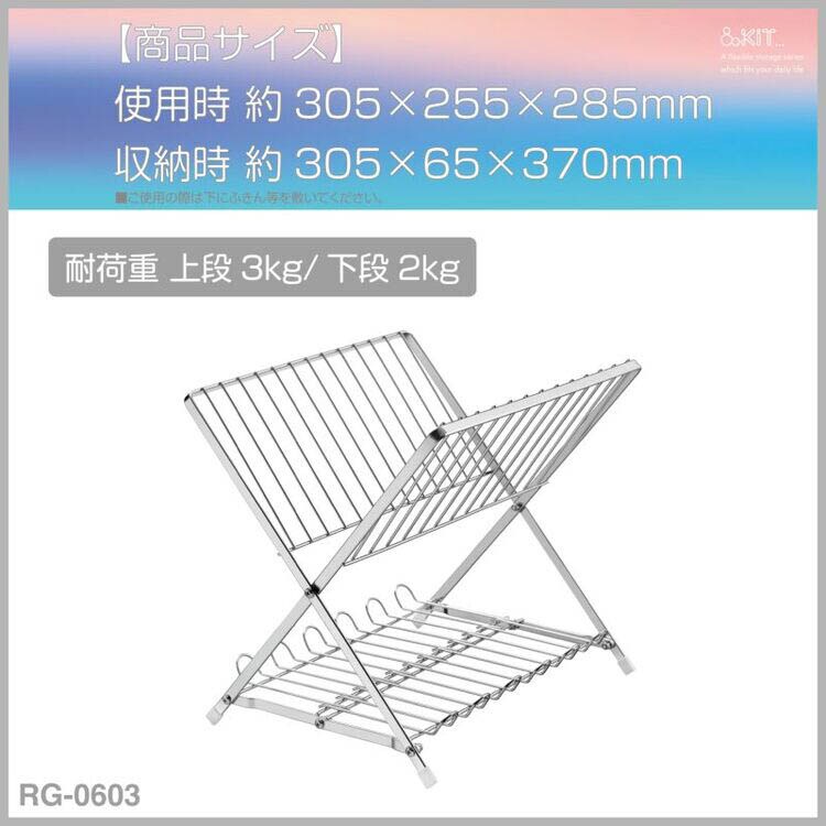 | 商品サイズ(使用時):約305×255×285mm 商品サイズ(収納時):約305×65×370mm 重量:約920g 耐荷重:上段3Kg/下段2kg 材質:本体:ステンレス鋼、足部:塩化ビニル樹脂 |