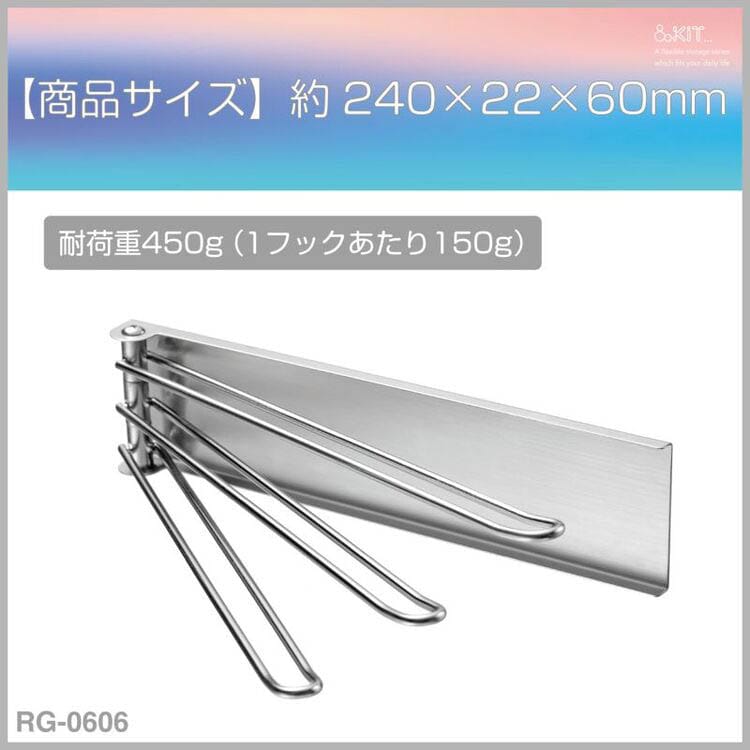 | 商品サイズ:約240×22×60mm 重量:約330g 耐荷重:450g(1フックあたり150g) 材質:本体:ステンレス鋼、マグネット部:マグネット |
