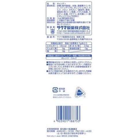 | 砂糖(国内製造)、水飴、濃縮果汁(いちご、パインアップル、オレンジ、レモン、りんご、メロン、すもも)、/酸味料、香料、着色料(紫コーン色素、パプリカ色素、カロチン、紅麹、クチナシ、紅花黄)、(一部にオレンジ・りんごを含む) |