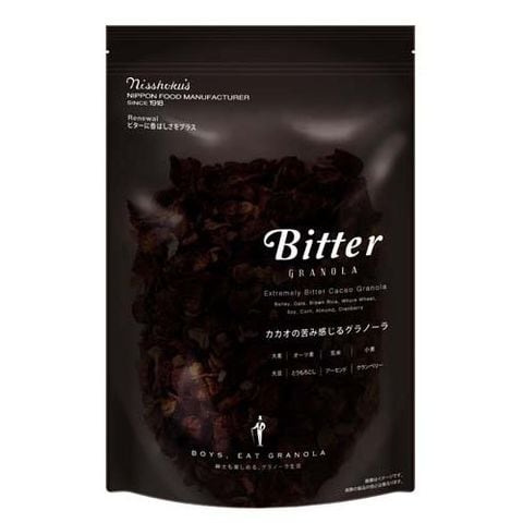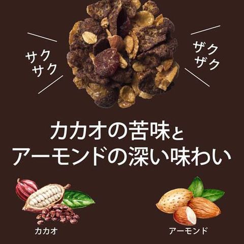 ●大麦、オーツ麦、玄米、小麦、とうもろこし、大豆を組み合わせ、カカオパウダーの苦みと、アーモンドの深い味が感じられる、サクサクとザクザクの食感が楽しめるグラノーラです。
