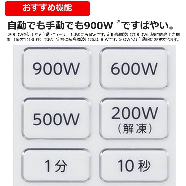 | ドアタイプ:たて開き 庫内形状:フラット庫内 センサー種類:絶対湿度センサー 庫内有効寸法(幅×奥行×高さ):約273mm×約315mm×約181mm ヘルツ:50Hz/60Hz 省エネ基準達成率:100%:目標年度 2008年 レンジ・庫内容量:17L レンジ出力(手動):900※/600・500W連続/200W相当 ※定格高周波出力900Wは短時間高出力機能(最大1分30秒)であり定格連続高周波出力は600Wです。600Wへは自動的に切り換わります。 年間消費電力量:59.9kWh/年 年間消費電力量(待機時):0kWh/年 電子レンジ機能の年間消費電力量:59.9kWh 操作部:ボタン 省エネ機能:省エネオートパワーOFF 設置条件:左10cm以上、右4.5cm以上、後方10cm以上、上方は15cm以上あけてください。上後左右いずれか一面を必ず開放してください |